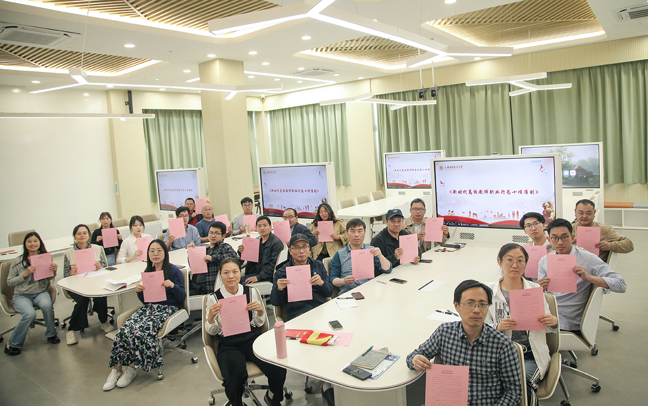 随后,全体教职工认真学习了《新时代高校教师职业行为十项准则》,每位教师都领取了师德师风相关承诺书并在承诺书上郑重签字。一诺千金,全体教师郑重承诺遵守新时代高校教师职业行为十项准则,严以律己投身教育事业。