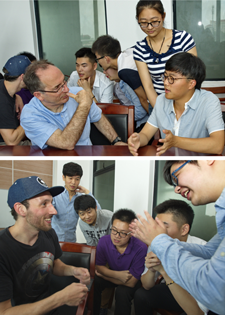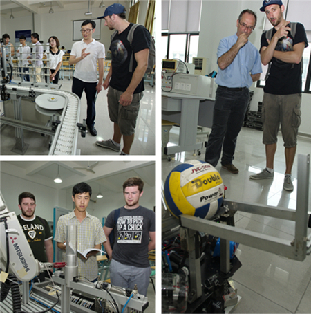 在大学生创新实验室中,我院同学展示了院大学生科创成果,包括医疗服务机器人、篮球机器人、服务机器人和体感技术。James Wright教授就篮球机器人的运动控制方式和模式识别技术与我院学生进行了深入交流,学生们从编程算法到机械结构,对James Wright教授做了详细介绍。James Wright教授有感于我院学生较强的动手能力,对我院学生的科创成果大加赞赏,表示希望有更多的同学能到塔拉理工交流访学,共享教学成果。