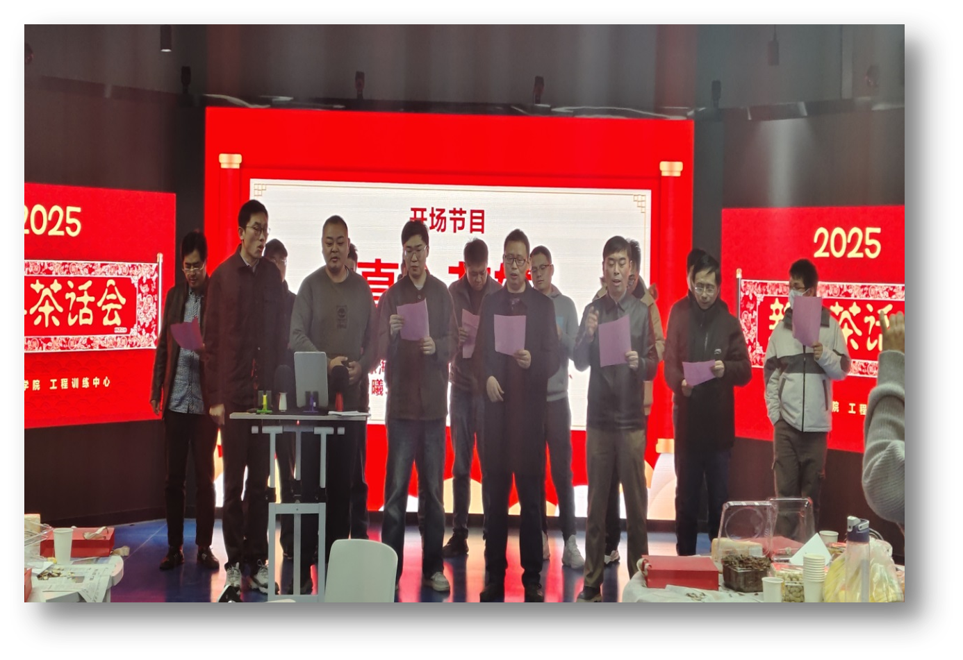 茶话会在王清成书记热情洋溢的致辞中拉开帷幕,王书记向所有教职工致以诚挚问候和新年祝福,回顾过去的一年,大家凝心聚力,守正创新,取得了不错的成绩,对全体教师的辛勤付出和无私奉献表示衷心的感谢并向大家致以新春的美好祝福,同时鼓励全体教师在即将到来的2025年继续砥砺前行,敢于创新、勇抓落实,为学院的高质量发展再立新功。致辞结束后,学院所有的男老师们齐声合唱经典歌曲《真心英雄》,激昂的旋律、深情的歌声在会场中回荡,展现了工程创新学院教师们团结一心、积极向上的精神风貌,也表达了大家对未来的美好憧憬和坚定信心,将现场气氛瞬间推向了高潮。