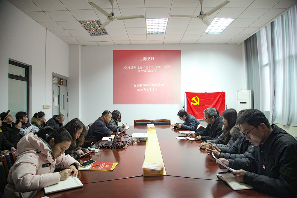 1月19日中午12:15,工程创新学院直属党支部组织主题党日活动,深入学习贯彻落实习近平总书记考察上海的重要讲话精神,直属党支部书记王清成主持,李春俊同志领学,全体教师党员参加。