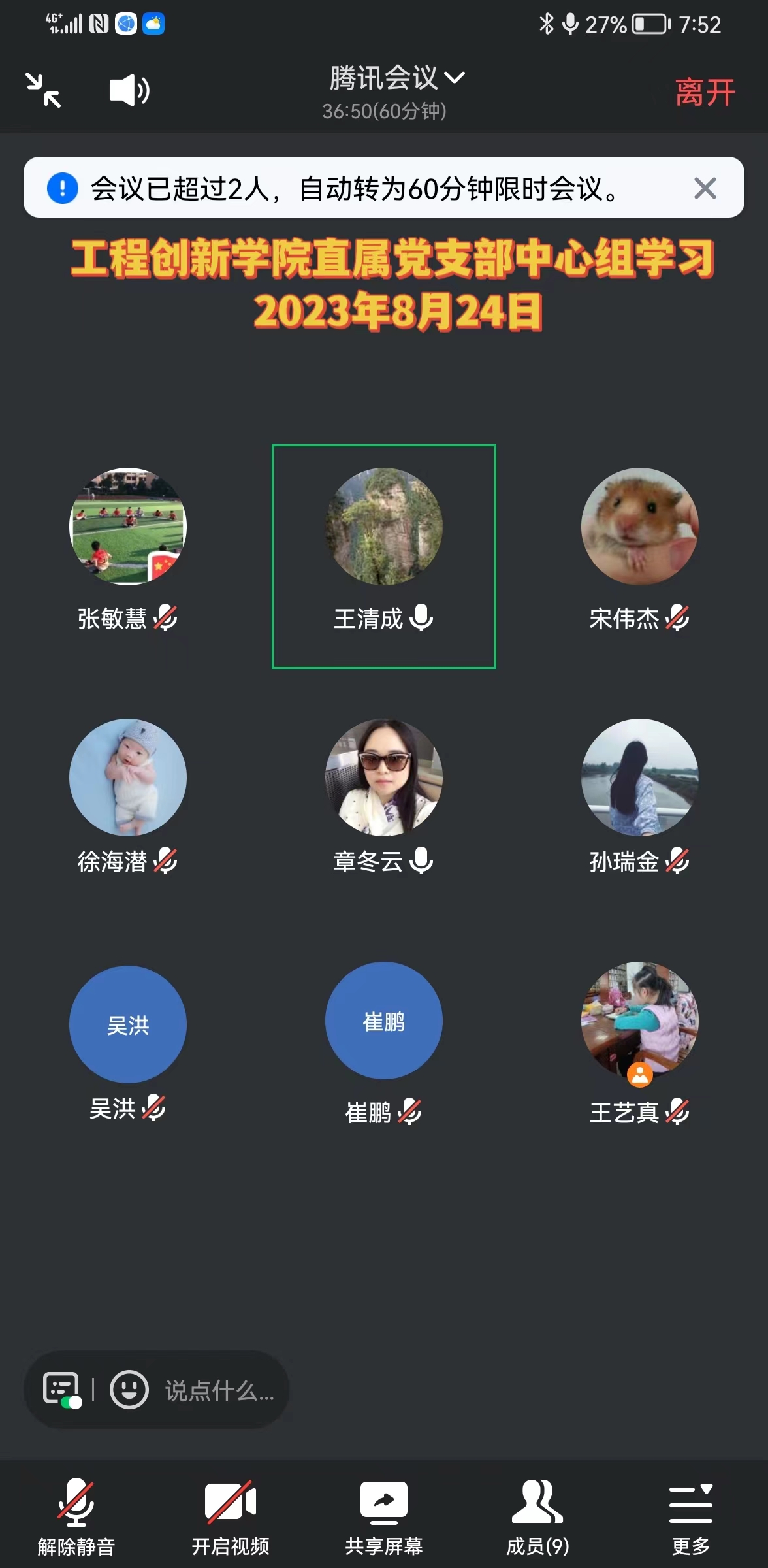 2023年8月24日,工程创新学院直属党支部组织中心组暑期线上学习,学习贯彻习近平新时代中国特色社会主义思想主题教育。会议认真学习领会习近平总书记关于党的建设的重要思想,学习习近平总书记关于严肃党内政治生活的重要讲话和重要指示批示精神,学习习近平总书记关于以学铸魂、以学增智、以学正风、以学促干等重要论述,学习习近平总书记关于高等教育以及相关专业领域的重要讲话和重要指示批示精神,具体由章冬云领学。会议认真学习领会党章、新形势下党内政治生活若干准则、县以上党和国家机关党员领导干部民主生活会若干规定等党内法规等,进一步统一思想、深化认识,具体由王清成领学。工程创新学院直属党支部书记王清成主持中心组学习会,常务副院长、副书记章冬云、工训中心三个小组长、三创工作负责人、分工会主席、院办主任、兼职组织员、宣传信息员参会。