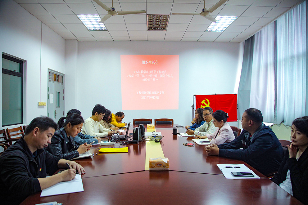 10月20日中午12:30,工程创新学院直属党支部在工训一馆召开组织生活会,学习第三届“一带一路”国际合作高峰论坛精神,会上党政领导带头进行本科教学审核评估工作动员。工创工训全体教师党员参加,直属党支部书记王清成主持并主讲。