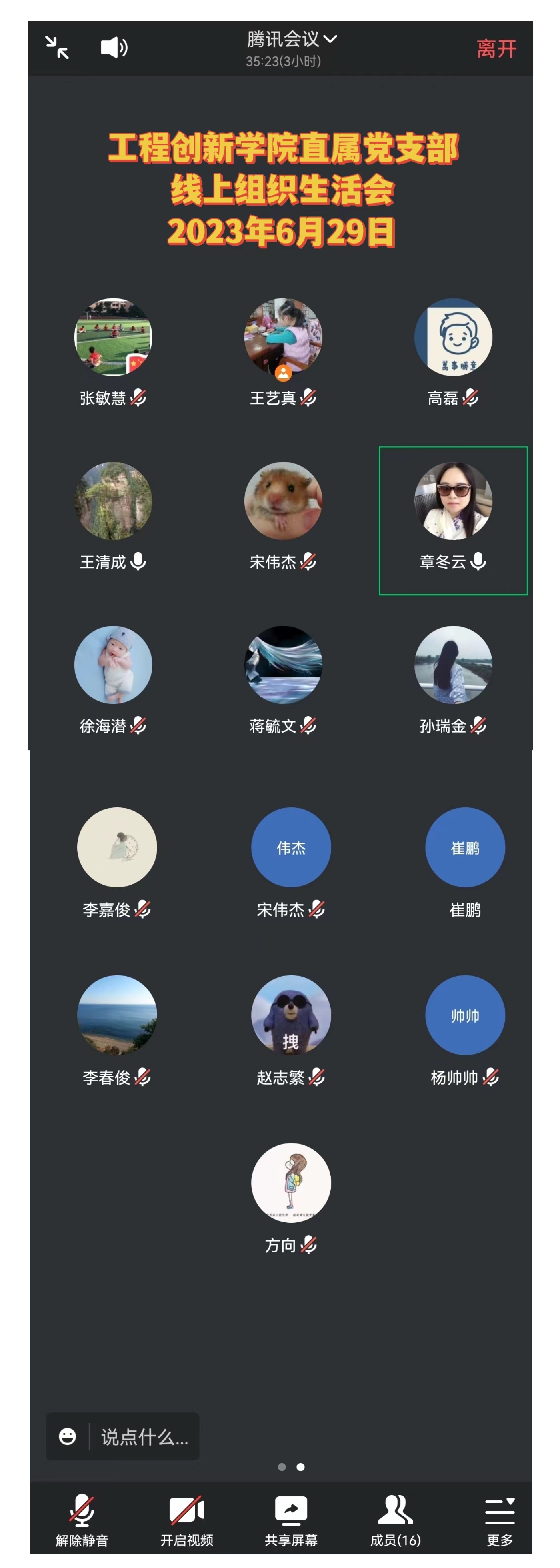 2023年6月29日晚,工程创新学院直属党支部召开线上组织生活会,学习贯彻习近平新时代中国特色社会主义思想主题教育,蒋毓文领学了“全心全意为人民服务——谈谈对党的根本宗旨的理解和实践”,章冬云领学了“习近平总书记在文化传承发展座谈会上重要讲话”。直属党支部书记王清成主持,工创工训全体教师党员参加。