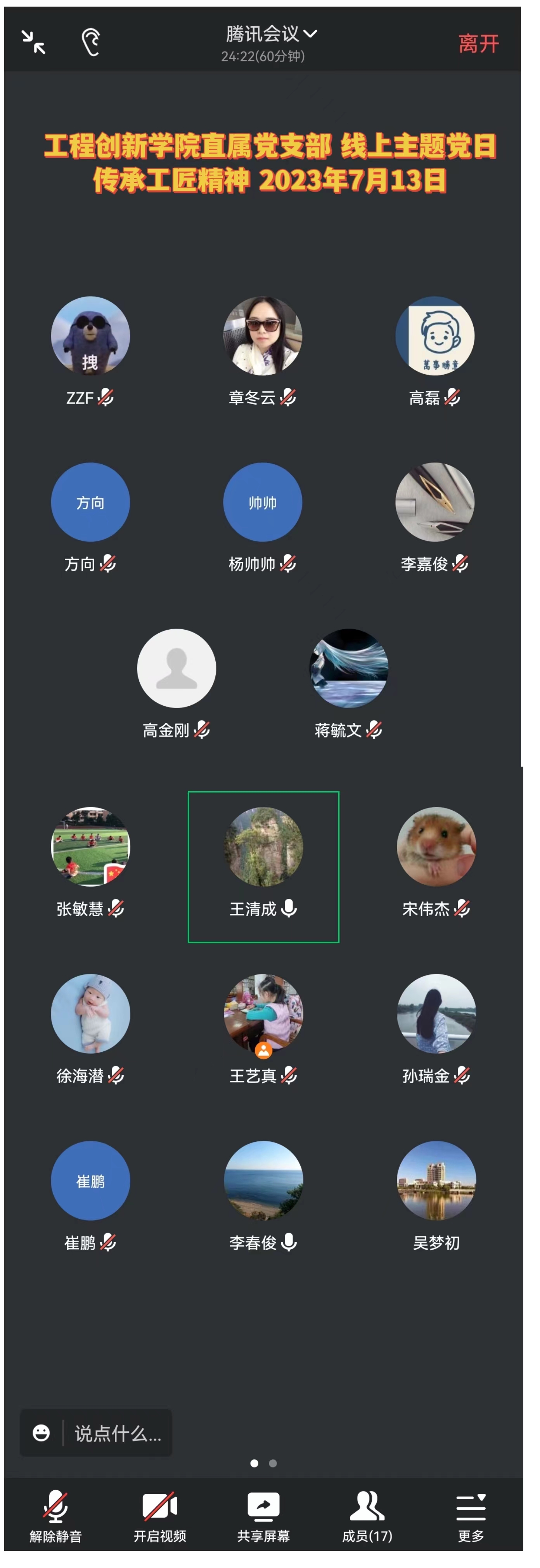 2023年7月13日晚,工程创新学院直属党支部组织“践行工匠精神,做个合格党员”线上主题党日,学习贯彻习近平新时代中国特色社会主义思想主题教育。主题党日由工程创新学院直属党支部王清成主持。