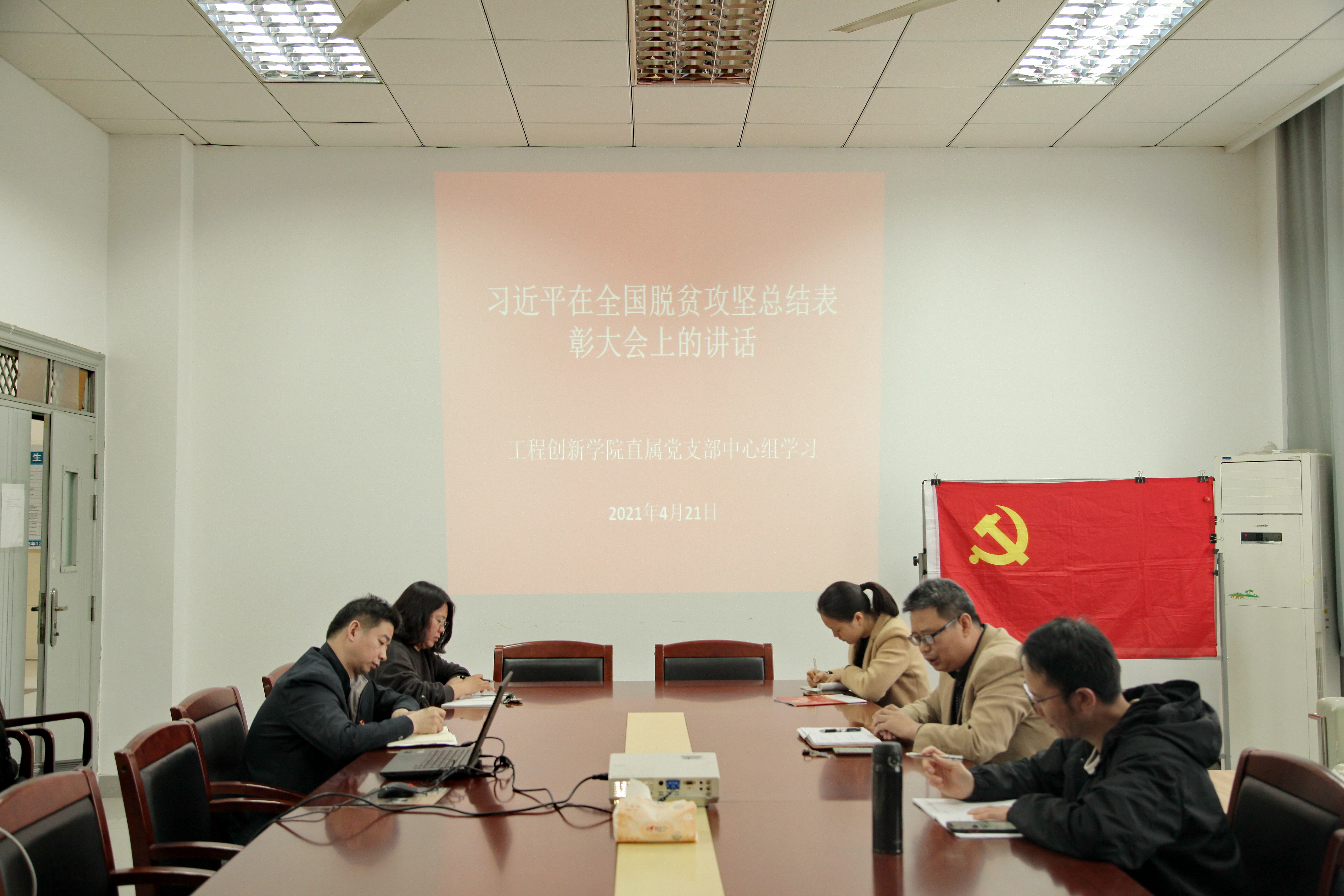 2021年4月21日上午10点,工程创新学院直属党支部中心组成员在工训一馆306会议室开展学习,参会人员通过直属党支部书记王清成领学,集中学习了“习近平在全国脱贫攻坚总结表彰大会上的讲话”,并纷纷发表了学习感言。中国共产党从成立之日起,就坚持把为中国人民谋幸福、为中华民族谋复兴作为初心使命,团结带领中国人民为创造自己的美好生活进行了长期艰辛奋斗。事实充分证明,中国共产党具有无比坚强的领导力、组织力、执行力,是团结带领人民攻坚克难、开拓前进最可靠的领导力量。“习近平在全国脱贫攻坚总结表彰大会上的讲话”由习近平总书记发表于今年2月25日的全国脱贫攻坚总结表彰大会上,是中国共产党领导全国人民脱贫攻坚,创造美好生活的一个里程碑。通过学习,各位党员干部也更加切身体会到,党和国家一直把实现好、维护好、发展好最广大人民根本利益作为一切工作的出发点和落脚点,更加自觉地使改革发展成果更多更公平惠及全体人民,这也是广大党员和党员干部做工作的出发点和落脚点。