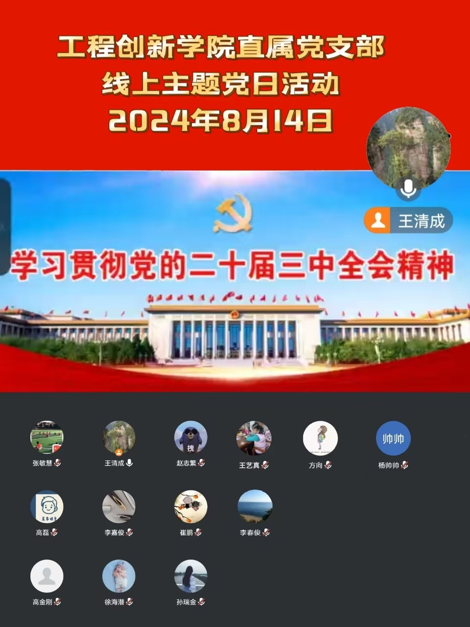 2024年8月14日下午,工程创新学院直属党支部开展线上主题党日活动,全体党员学习贯彻党的二十届三中全会精神,直属党支部书记王清成主持并领学,工程创新学院、工程训练中心全体教师党员参加。