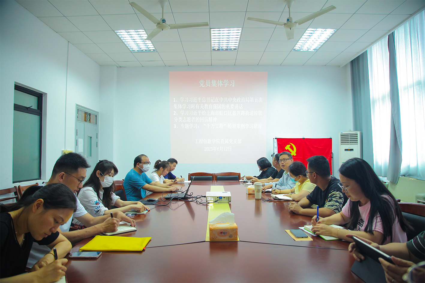 2023年6月12日,工程创新学院直属党支部组织教师党员集中学习习近平总书记在中共中央政治局第五次集体学习时有关教育强国的重要讲话、习近平给上海市虹口区嘉兴路街道垃圾分类志愿者的回信精神、“千万工程”经验案例学习研讨。工程创新学院直属党支部书记王清成主持并领学,工程创新学院、工程训练中心全体教师党员参加。