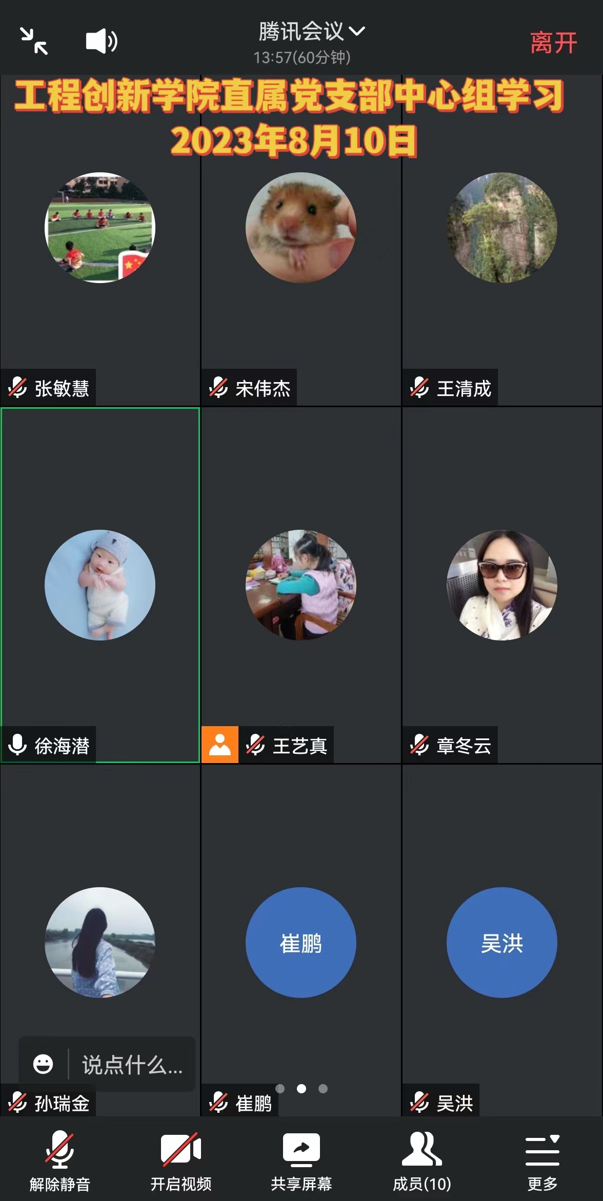 2023年8月10日,工程创新学院直属党支部组织中心组暑期线上学习,学习贯彻习近平新时代中国特色社会主义思想主题教育。工训教师党员徐海潜领学,领学题目“增强忧患意识,踔厉奋进新征程”,包括中华优秀传统文化蕴含着忧患意识的思想光辉、中国共产党百年奋斗历史彰显了增强忧患意识的政治智慧、新时代新征程必须增强忧患意识三个部分的内容。会议由工程创新学院直属党支部书记王清成主持,常务副院长、副书记章冬云、工训中心三个小组长、三创工作负责人、分工会主席、院办主任、兼职组织员、宣传信息员参会。
