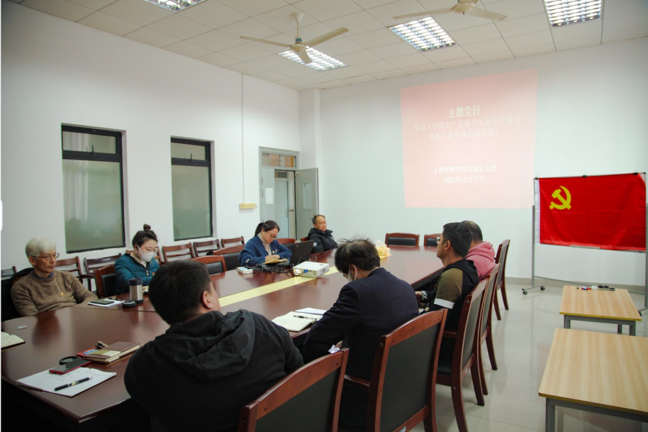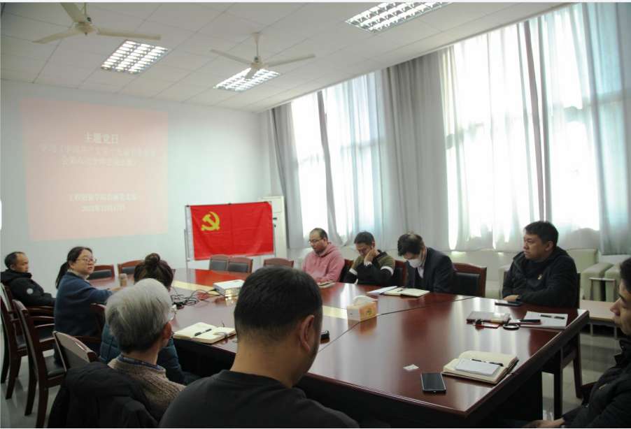 2021年12月17日下午,工程创新学院直属党支部在306会议室开展主题党日活动,直属党支部副书记章冬云主持会议,工创工训党员教职工一起认真学习领会了《中国共产党第十九届中央委员会第六次全体会议公报》。