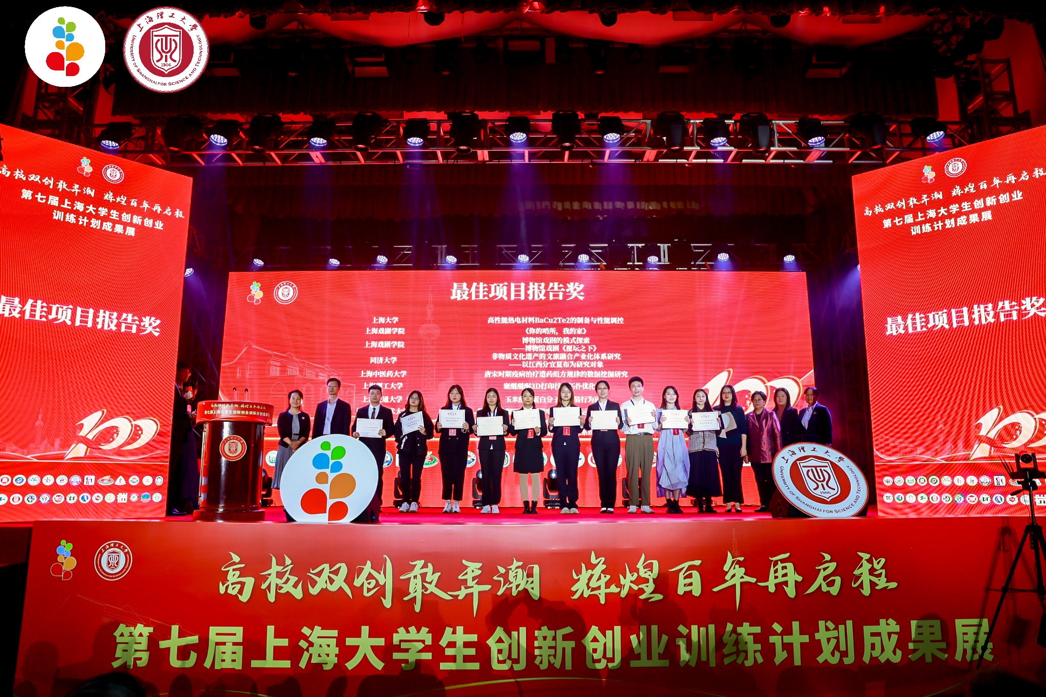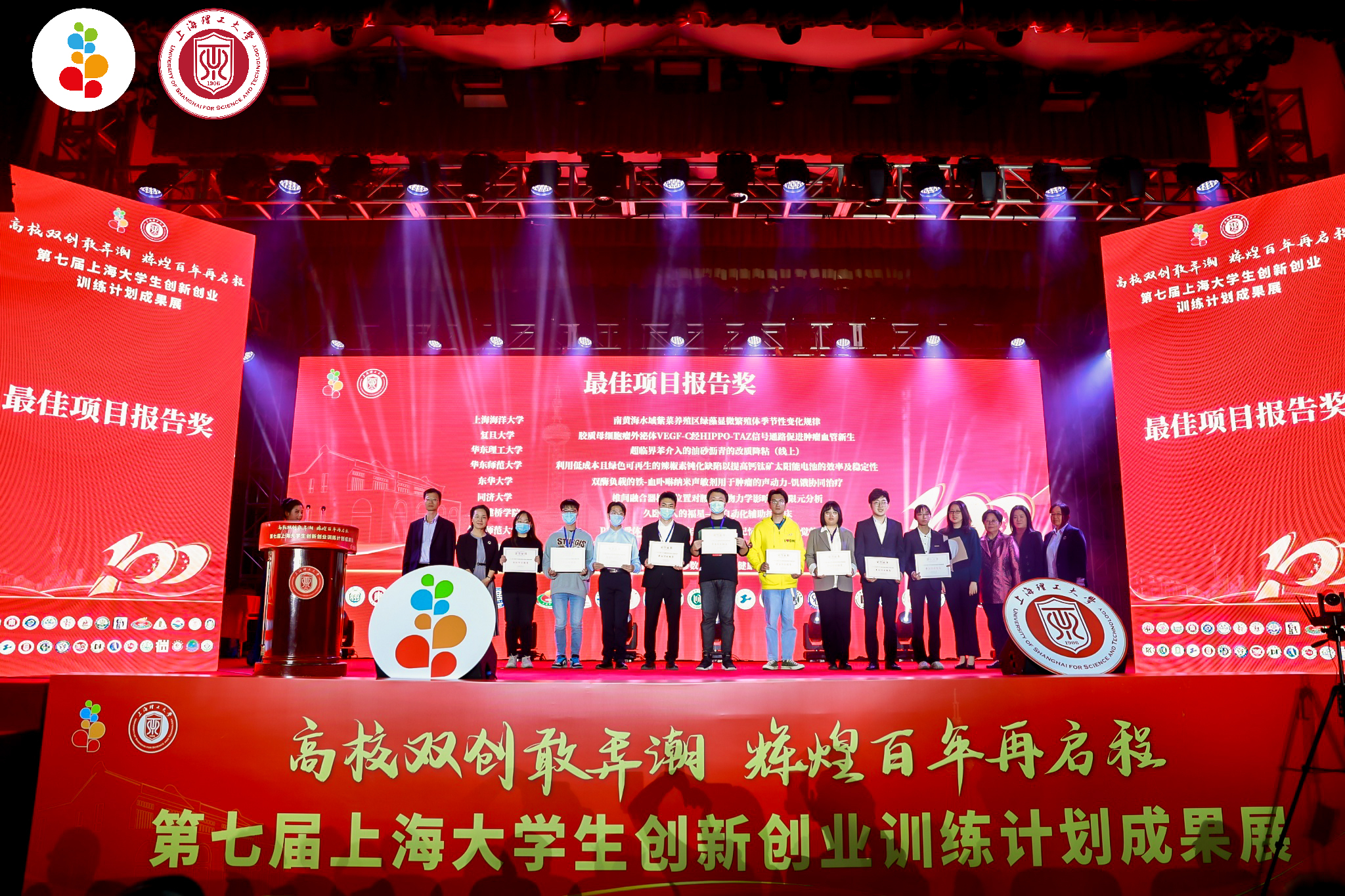 2021年10月23日,由上海市教育委员会主办、上海理工大学承办、31所上海市创新创业训练计划参与高校协办的“第七届上海大学生创新创业成果展”在上海理工大学举行。本届成果展共向31所高校征集了97篇学生创新项目报告、46篇创业项目报告、94块创新创业展板作品和117篇教师论文。我校有三个创新项目、两个创业项目、三个展板项目入围成果展。其中,材料学院的“自发光振荡标线”、轨交学院的“轨交智维宝”项目作为学校创新报告参展,通过项目答辩路演、专家点评等环节,从97个创新项目中脱颖而出,荣获最佳项目报告奖。