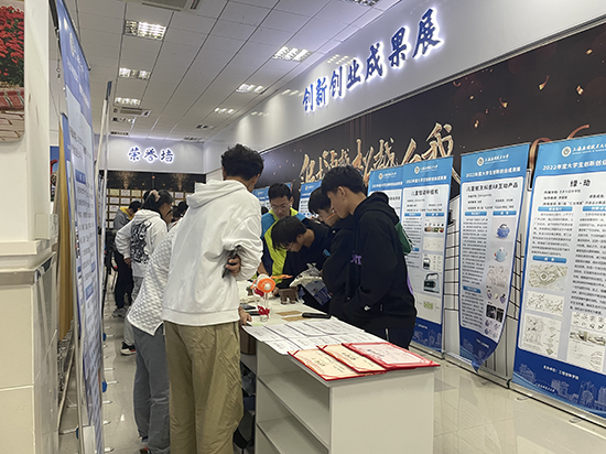 本次展会聚焦科技创新、文化创意和项目与未来商业的融合与发展。现场各学科、各领域的创新创意项目让人眼前一亮,包括“萱草”母亲花——脱贫攻坚的幸福花、光效一体智慧交通领导者、氟菌灵-1.1类一线新型小分子抗菌药、智能医疗柜——精准医疗先行者、愿做你的眼——基于微电流式驱动电路的触感智能盲文阅读装置等,我校项目在各级各类创新创业竞赛中屡获佳绩,今年在第九届上海市“互联网+”大学生创新创业大赛中,荣获金奖2项、银奖9项、铜奖27项、优胜奖8项,取得获奖总数全市第二、市属高校第一的好成绩!